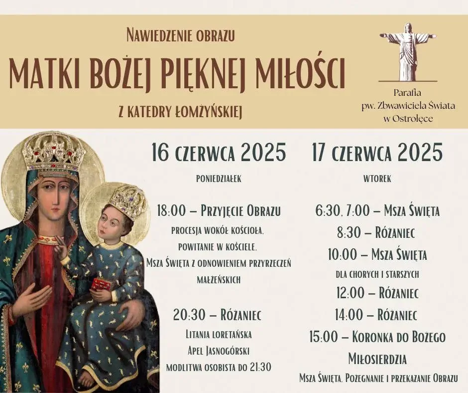 Z radością informujemy, że nasza parafia będzie gościć obraz Matki Bożej Pięknej Miłości z Katedry Łomżyńskiej. To szczególny czas łaski, modlitwy i zawierzenia się Maryi.